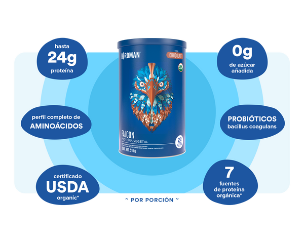 Falcon Protein está diseñada para apoyar tu ingesta de nutrientes diarios y está disponible en sabores orgánicos de chocolate, vainilla, chai, natural y fresa.