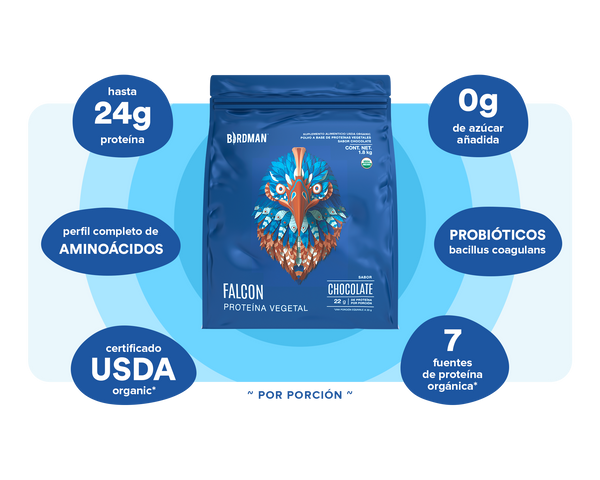 Falcon Protein está diseñada para apoyar tu ingesta de nutrientes diarios y está disponible en sabores orgánicos de chocolate y vainilla.