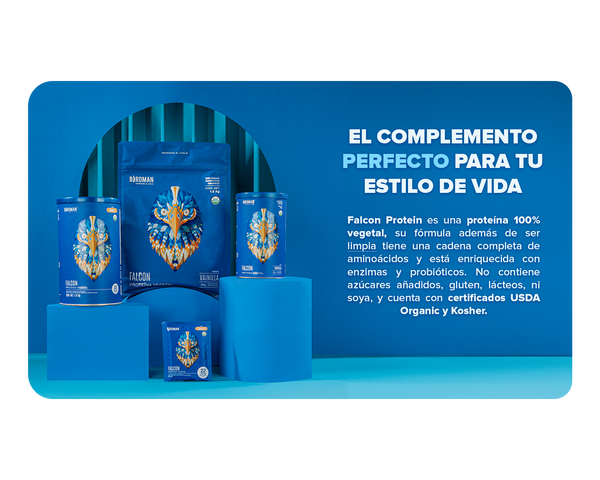Falcon Protein está diseñada para apoyar tu ingesta de nutrientes diarios y está disponible en sabores orgánicos de chocolate y vainilla.