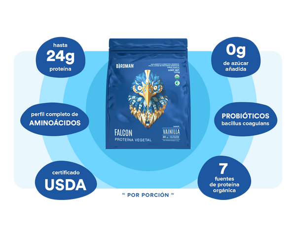 Falcon Protein es una proteína 100% vegetal con cadena de aminoácidos completa gracias a su sinergia de 7 fuentes de proteína. Además, contiene una mezcla de enzimas y probióticos.