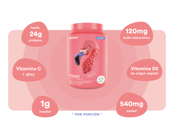 Fitmingo es una proteína 100% vegetal con ácido hialurónico, Svetol®, Inositol, PureWay C® (Vitamina C), Vitamina D3 (de origen vegetal) y Zincnova® (Zinc), ideal para complementar tu estilo de vida.