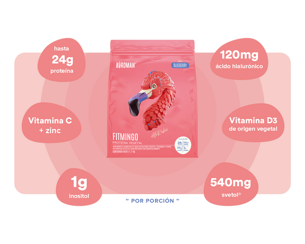 Fitmingo es una proteína 100% vegetal con ácido hialurónico, Svetol®, Inositol, PureWay C® (Vitamina C), Vitamina D3 (de origen vegetal) y Zincnova® (Zinc), ideal para complementar tu estilo de vida.
