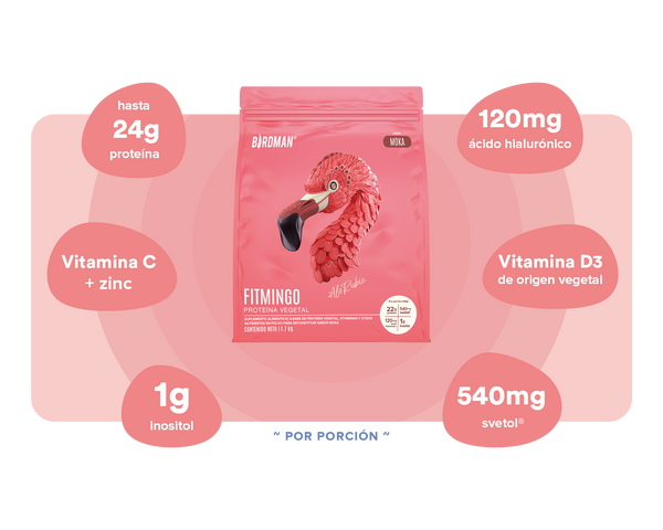 Fitmingo es una proteína 100% vegetal con ácido hialurónico, Svetol®, Inositol, PureWay C® (Vitamina C), Vitamina D3 (de origen vegetal) y Zincnova® (Zinc), ideal para complementar tu estilo de vida.