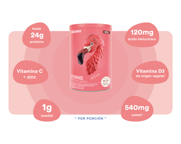 Fitmingo es una proteína 100% vegetal con ácido hialurónico, Svetol®, Inositol, PureWay C® (Vitamina C), Vitamina D3 (de origen vegetal) y Zincnova® (Zinc), ideal para complementar tu estilo de vida.