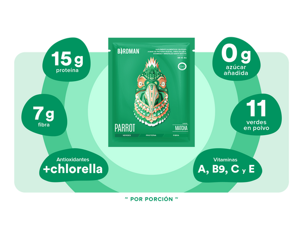 Parrot Greens & Protein es un complemento alimenticio que contiene super alimentos acuáticos y terrestres con alto contenido de verdes, proteína, fibra, y micronutrientes 100% de origen vegetal. Si se te suele olvidar o se te complica consumir ensaladas verdes durante el día, ¡Parrot te puede ayudar! Con sabores Matcha y BerryVanilla, Parrot Greens & Protein es ligero al estómago e ideal para tomarse como colación durante el día. ¡Parrot es nutrición práctica!