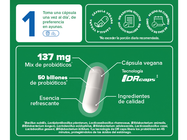 Elaborado con una mezcla 100% vegetal, libre de contaminantes y sin aditivos ocultos, Premium All-In-One Probiotic es ideal para quienes buscan lo mejor en probióticos. Sus cápsulas veganas de alta calidad tienen una esencia refrescante y están diseñadas para integrarse sin esfuerzo en la rutina diaria.