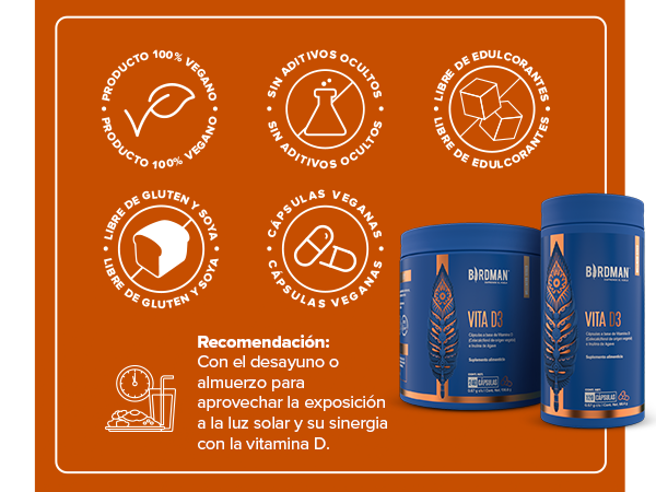 Comprometido con la sostenibilidad, Birdman Vitamina D3 es libre de azúcar, gluten, soya y lácteos, lo que lo convierte en una opción plant-based y cruelty free. Elaborado con ingredientes cuidadosamente seleccionados, este suplemento refleja el compromiso de Birdman con la transparencia, ofreciendo una nutrición confiable y adaptada a un estilo de vida moderno.